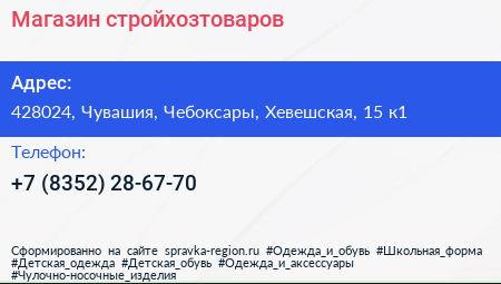 Магазин стройхозтоваров по адресу 428024, Чувашия, Чебоксары, Хевешская, 15 к1 в дальнейшем Организация, размещена в следующих категориях: