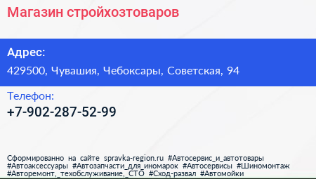 Магазин стройхозтоваров по адресу 429500, Чувашия, Чебоксары, Советская, 94 в дальнейшем Организация, размещена в следующих категориях: