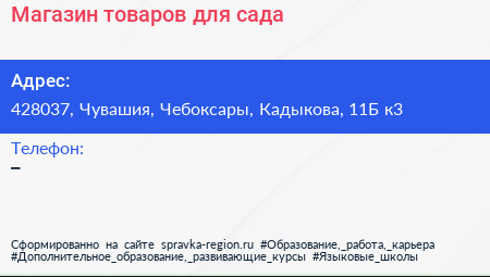 Магазин товаров для сада по адресу 428037, Чувашия, Чебоксары, Кадыкова, 11Б к3 в дальнейшем Организация, размещена в следующих категориях: