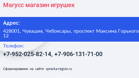 Магусс, магазин игрушек по адресу 428001, Чувашия, Чебоксары, проспект Максима Горького, 12 в дальнейшем Организация, размещена в следующих категориях: