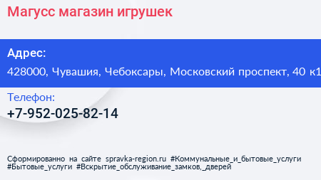 Магусс, магазин игрушек по адресу 428000, Чувашия, Чебоксары, Московский проспект, 40 к1 в дальнейшем Организация, размещена в следующих категориях: