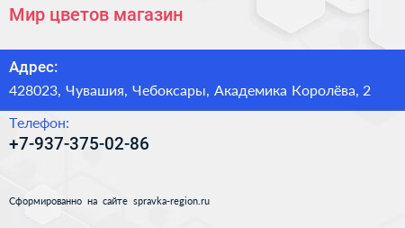 Мир цветов, магазин по адресу 428023, Чувашия, Чебоксары, Академика Королёва, 2 в дальнейшем Организация, размещена в следующих категориях: