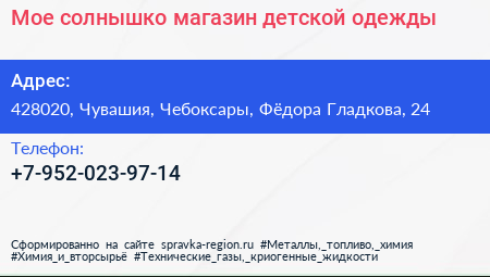Мое солнышко, магазин детской одежды по адресу 428020, Чувашия, Чебоксары, Фёдора Гладкова, 24 в дальнейшем Организация, размещена в следующих категориях: