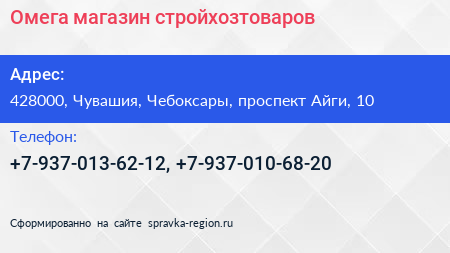 Омега, магазин стройхозтоваров по адресу 428000, Чувашия, Чебоксары, проспект Айги, 10 в дальнейшем Организация, размещена в следующих категориях: