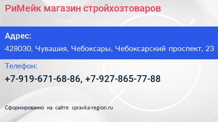 РиМейк, магазин стройхозтоваров по адресу 428030, Чувашия, Чебоксары, Чебоксарский проспект, 23 в дальнейшем Организация, размещена в следующих категориях: