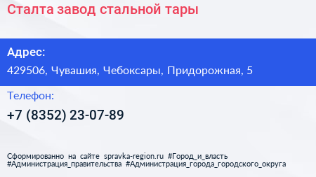 Сталта, завод стальной тары по адресу 429506, Чувашия, Чебоксары, Придорожная, 5 в дальнейшем Организация, размещена в следующих категориях: