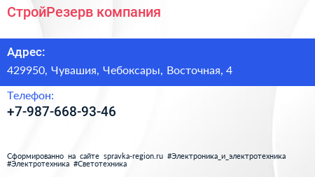 СтройРезерв, компания по адресу 429950, Чувашия, Чебоксары, Восточная, 4 в дальнейшем Организация, размещена в следующих категориях: