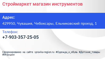 Строймаркет, магазин инструментов по адресу 429950, Чувашия, Чебоксары, Ельниковский проезд, 1 в дальнейшем Организация, размещена в следующих категориях: