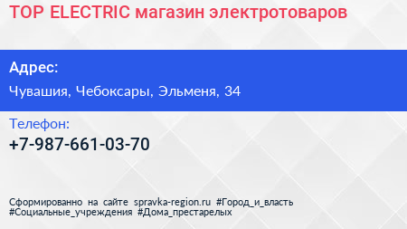 TOP ELECTRIC, магазин электротоваров по адресу Чувашия, Чебоксары, Эльменя, 34 в дальнейшем Организация, размещена в следующих категориях: