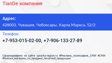 TianDe, компания по адресу 428003, Чувашия, Чебоксары, Карла Маркса, 52/2 в дальнейшем Организация, размещена в следующих категориях: