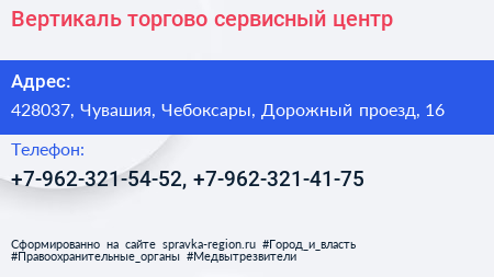 Вертикаль, торгово-сервисный центр по адресу 428037, Чувашия, Чебоксары, Дорожный проезд, 16 в дальнейшем Организация, размещена в следующих категориях: