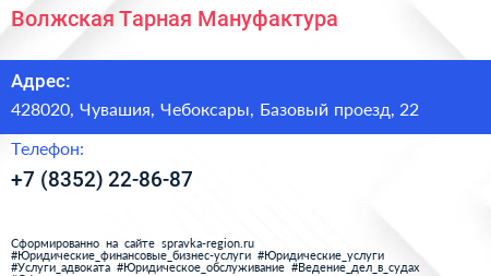 Волжская Тарная Мануфактура по адресу 428020, Чувашия, Чебоксары, Базовый проезд, 22 в дальнейшем Организация, размещена в следующих категориях: