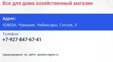 Все для дома, хозяйственный магазин по адресу 428026, Чувашия, Чебоксары, Гоголя, 3 в дальнейшем Организация, размещена в следующих категориях: