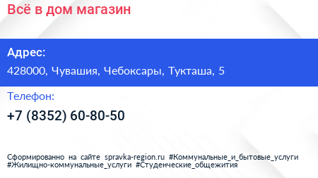 Всё в дом, магазин по адресу 428000, Чувашия, Чебоксары, Тукташа, 5 в дальнейшем Организация, размещена в следующих категориях: