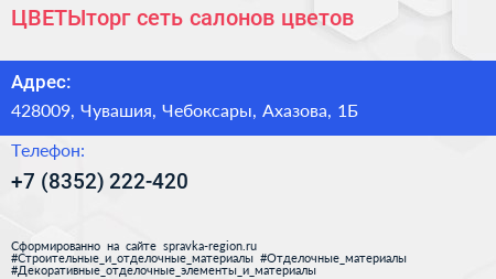 ЦВЕТЫторг, сеть салонов цветов по адресу 428009, Чувашия, Чебоксары, Ахазова, 1Б в дальнейшем Организация, размещена в следующих категориях: