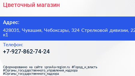 Цветочный магазин по адресу 428031, Чувашия, Чебоксары, 324 Стрелковой дивизии, 22 к1 в дальнейшем Организация, размещена в следующих категориях: