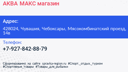 АКВА-МАКС, магазин по адресу 428024, Чувашия, Чебоксары, Мясокомбинатский проезд, 14в в дальнейшем Организация, размещена в следующих категориях: