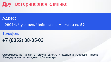 Друг, ветеринарная клиника по адресу 428014, Чувашия, Чебоксары, Ашмарина, 59 в дальнейшем Организация, размещена в следующих категориях: