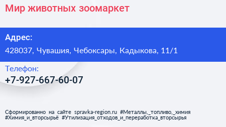Мир животных, зоомаркет по адресу 428037, Чувашия, Чебоксары, Кадыкова, 11/1 в дальнейшем Организация, размещена в следующих категориях: