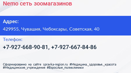 Nemo, сеть зоомагазинов по адресу 429955, Чувашия, Чебоксары, Советская, 40 в дальнейшем Организация, размещена в следующих категориях: