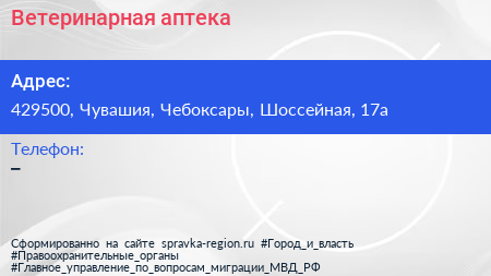 Ветеринарная аптека по адресу 429500, Чувашия, Чебоксары, Шоссейная, 17а в дальнейшем Организация, размещена в следующих категориях: