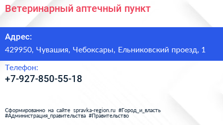 Ветеринарный аптечный пункт по адресу 429950, Чувашия, Чебоксары, Ельниковский проезд, 1 в дальнейшем Организация, размещена в следующих категориях: