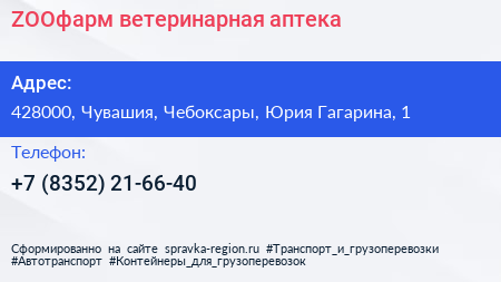 ZOOфарм, ветеринарная аптека по адресу 428000, Чувашия, Чебоксары, Юрия Гагарина, 1 в дальнейшем Организация, размещена в следующих категориях: