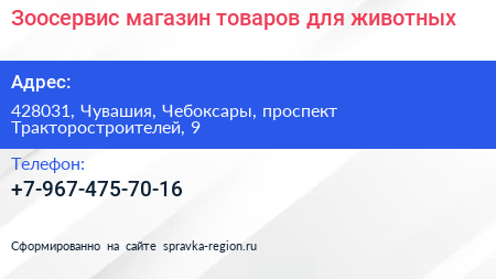 Зоосервис, магазин товаров для животных по адресу 428031, Чувашия, Чебоксары, проспект Тракторостроителей, 9 в дальнейшем Организация, размещена в следующих категориях: