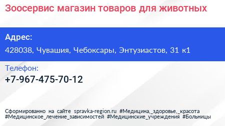 Зоосервис, магазин товаров для животных по адресу 428038, Чувашия, Чебоксары, Энтузиастов, 31 к1 в дальнейшем Организация, размещена в следующих категориях: