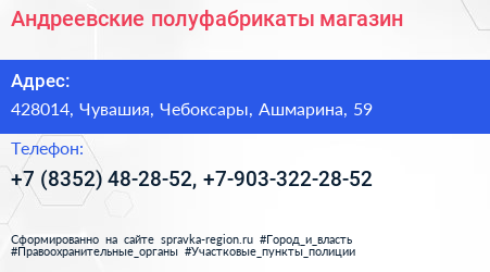 Андреевские полуфабрикаты, магазин по адресу 428014, Чувашия, Чебоксары, Ашмарина, 59 в дальнейшем Организация, размещена в следующих категориях: