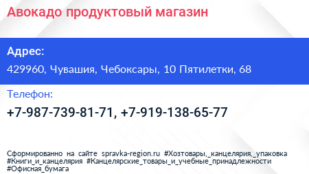 Авокадо, продуктовый магазин по адресу 429960, Чувашия, Чебоксары, 10 Пятилетки, 68 в дальнейшем Организация, размещена в следующих категориях: