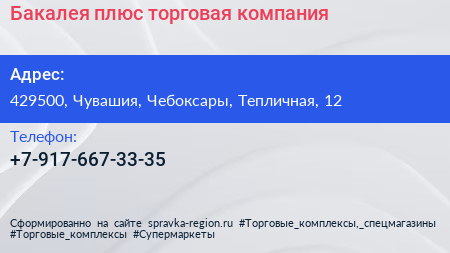Бакалея плюс, торговая компания по адресу 429500, Чувашия, Чебоксары, Тепличная, 12 в дальнейшем Организация, размещена в следующих категориях: