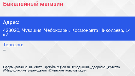 Бакалейный магазин по адресу 428020, Чувашия, Чебоксары, Космонавта Николаева, 14 к7 в дальнейшем Организация, размещена в следующих категориях: