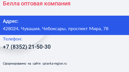Белла, оптовая компания по адресу 428024, Чувашия, Чебоксары, проспект Мира, 78 в дальнейшем Организация, размещена в следующих категориях: