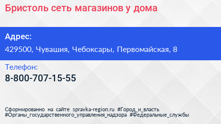 Бристоль, сеть магазинов у дома по адресу 429500, Чувашия, Чебоксары, Первомайская, 8 в дальнейшем Организация, размещена в следующих категориях: