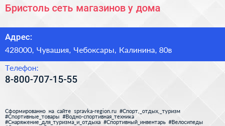 Бристоль, сеть магазинов у дома по адресу 428000, Чувашия, Чебоксары, Калинина, 80в в дальнейшем Организация, размещена в следующих категориях:
