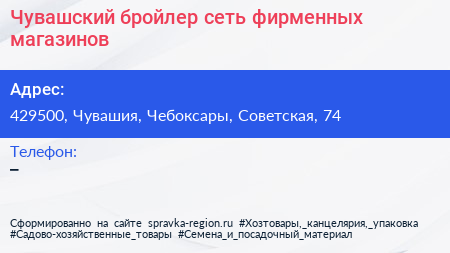 Чувашский бройлер, сеть фирменных магазинов по адресу 429500, Чувашия, Чебоксары, Советская, 74 в дальнейшем Организация, размещена в следующих категориях: