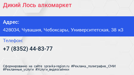 Дикий Лось, алкомаркет по адресу 428034, Чувашия, Чебоксары, Университетская, 38 к3 в дальнейшем Организация, размещена в следующих категориях: