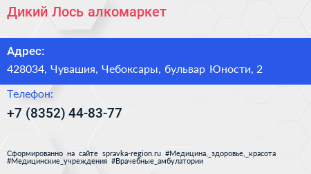 Дикий Лось, алкомаркет по адресу 428034, Чувашия, Чебоксары, бульвар Юности, 2 в дальнейшем Организация, размещена в следующих категориях: