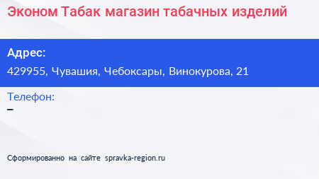 Эконом Табак, магазин табачных изделий по адресу 429955, Чувашия, Чебоксары, Винокурова, 21 в дальнейшем Организация, размещена в следующих категориях: