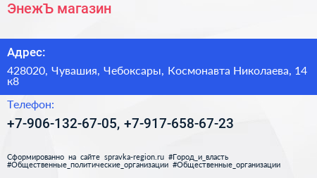 ЭнежЪ, магазин по адресу 428020, Чувашия, Чебоксары, Космонавта Николаева, 14 к8 в дальнейшем Организация, размещена в следующих категориях: