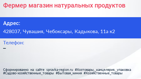 Фермер, магазин натуральных продуктов по адресу 428037, Чувашия, Чебоксары, Кадыкова, 11а к2 в дальнейшем Организация, размещена в следующих категориях: