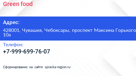 Green food по адресу 428001, Чувашия, Чебоксары, проспект Максима Горького, 10а в дальнейшем Организация, размещена в следующих категориях: