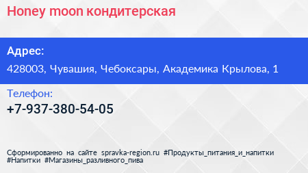 Honey moon, кондитерская по адресу 428003, Чувашия, Чебоксары, Академика Крылова, 1 в дальнейшем Организация, размещена в следующих категориях: