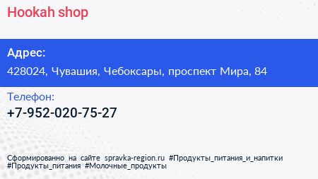 Hookah shop по адресу 428024, Чувашия, Чебоксары, проспект Мира, 84 в дальнейшем Организация, размещена в следующих категориях: