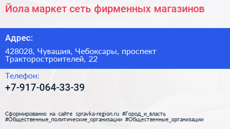 Йола-маркет, сеть фирменных магазинов по адресу 428028, Чувашия, Чебоксары, проспект Тракторостроителей, 22 в дальнейшем Организация, размещена в следующих категориях: