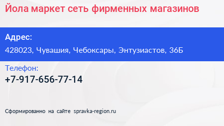 Йола-маркет, сеть фирменных магазинов по адресу 428023, Чувашия, Чебоксары, Энтузиастов, 36Б в дальнейшем Организация, размещена в следующих категориях: