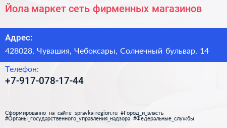 Йола-маркет, сеть фирменных магазинов по адресу 428028, Чувашия, Чебоксары, Солнечный бульвар, 14 в дальнейшем Организация, размещена в следующих категориях: