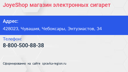 JoyeShop, магазин электронных сигарет по адресу 428023, Чувашия, Чебоксары, Энтузиастов, 34 в дальнейшем Организация, размещена в следующих категориях: