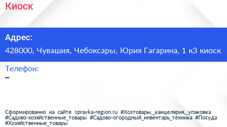 Киоск по адресу 428000, Чувашия, Чебоксары, Юрия Гагарина, 1 к3 киоск в дальнейшем Организация, размещена в следующих категориях: